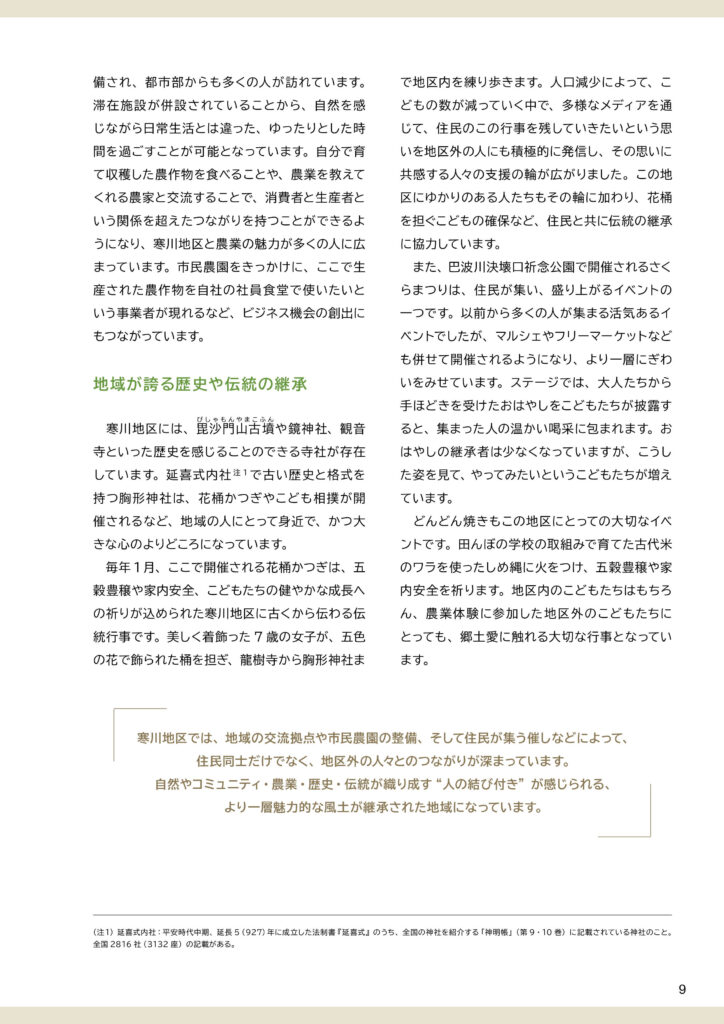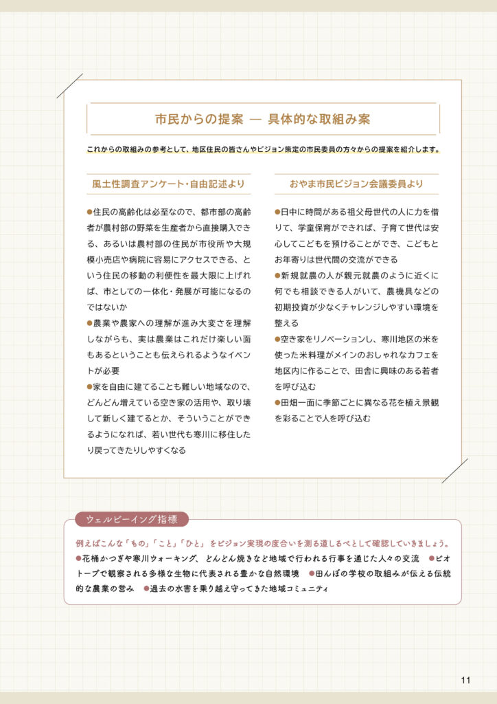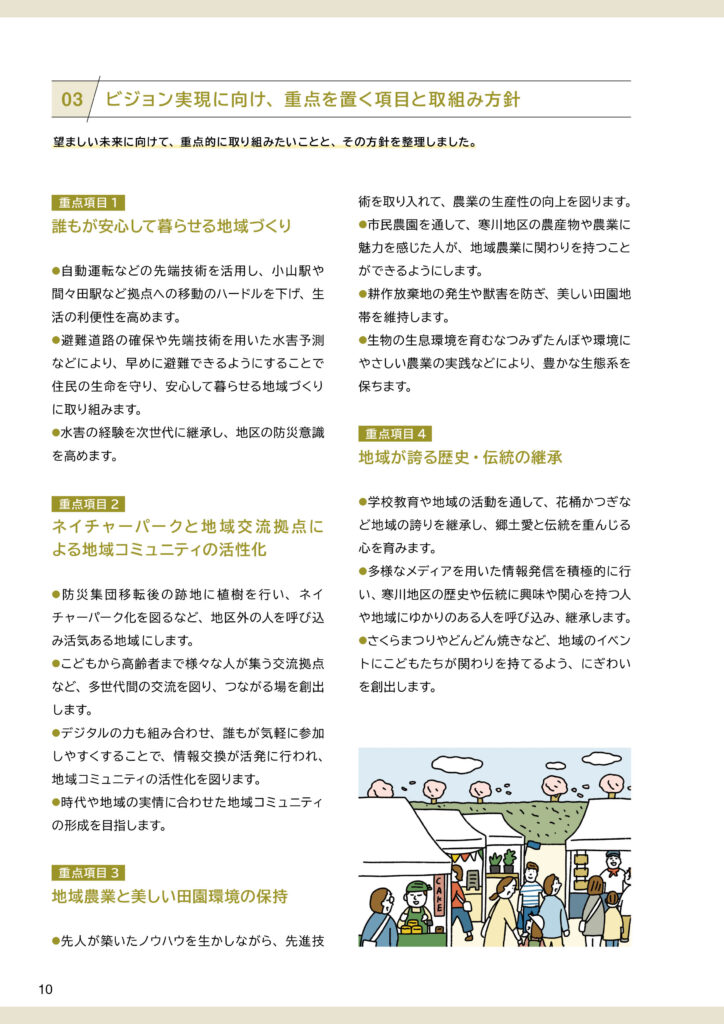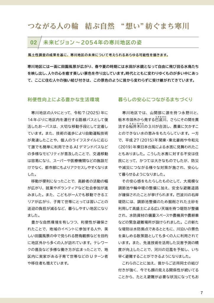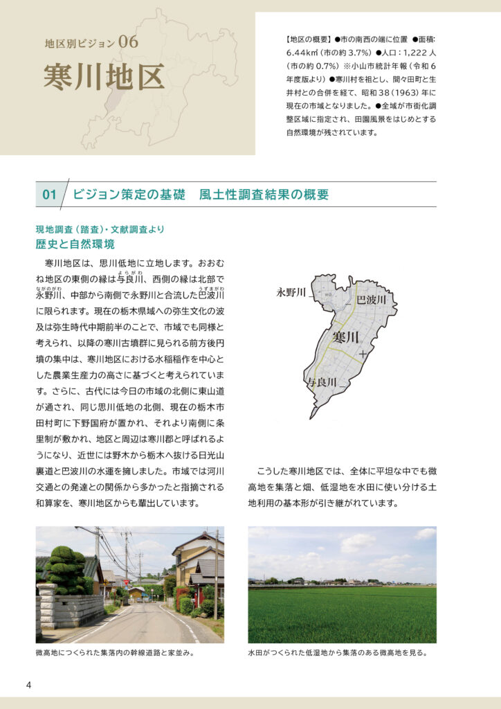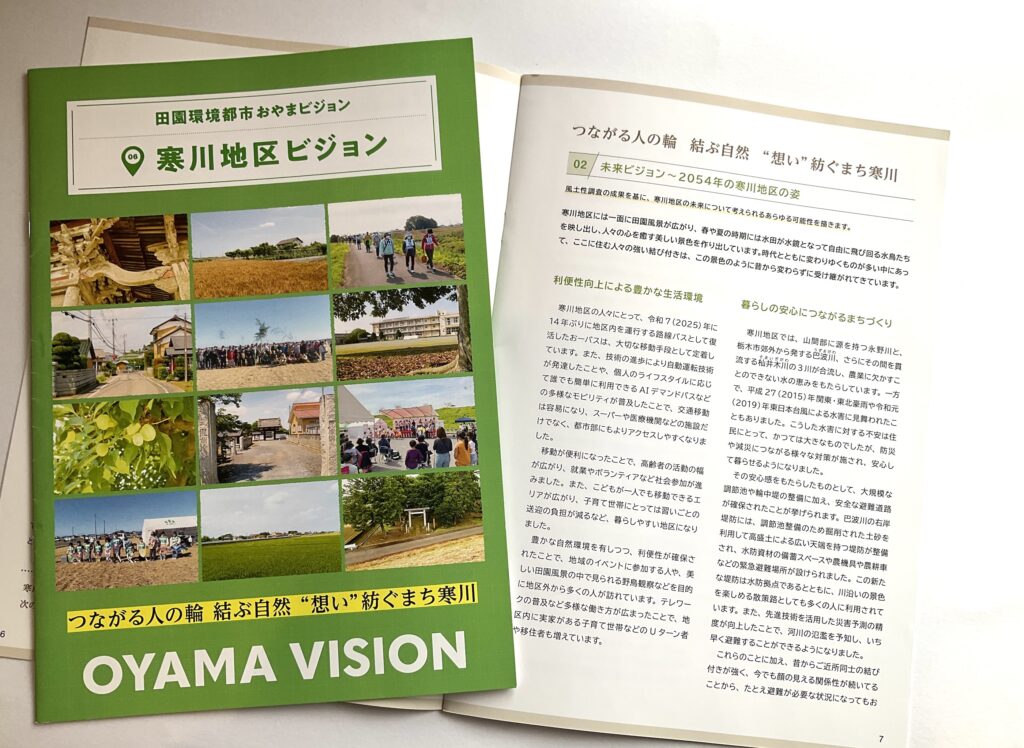 寒川地区ビジョンと策定前後の取組みについて寒川地区ビジョンは、令和7(2025)年3月に完成した「田園環境都市おやまビジョン」の重要な構成要素のひとつとして策定されました。ここでは、❶策定された「寒川地区ビジョン」の内容、❷策定までの取組み、❸策定後の令和7(2025)年度の取組みを掲載します。