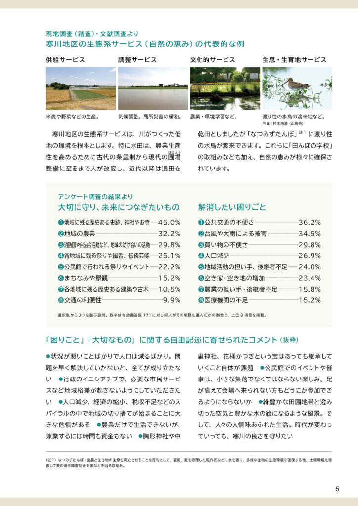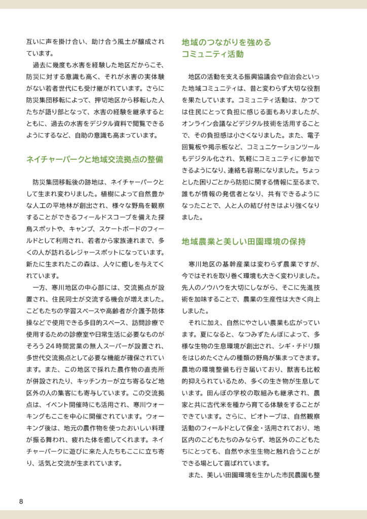 地区別のビジョン冊子を制作しました。冊子の構成は以下のとおりです。①ビジョンと策定プロセスの説明 ②地区別ビジョン(本編より転載) ③アサッテ広場に連載していた白鴎大学地域メディア実践ゼミの取材制作による「未来ノート」④地区の自然の恵み(生態系サービス)