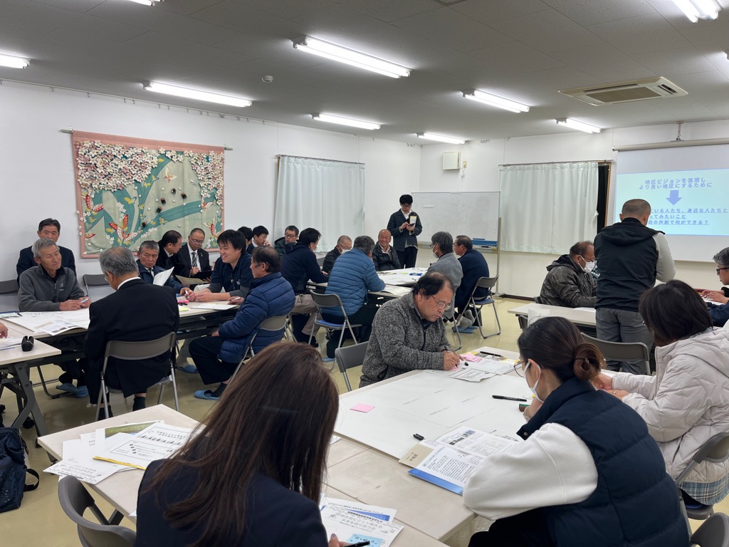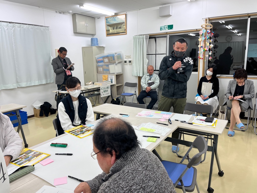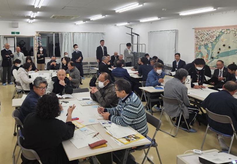 この冊子を資料として、「地区別ビジョン報告会 未来を語り合う会」と題した集まりをもちました。地区別ビジョンの策定プロセスや内容についての報告を行い、さらに参加の皆様で地区の未来について意見交換を行いました。