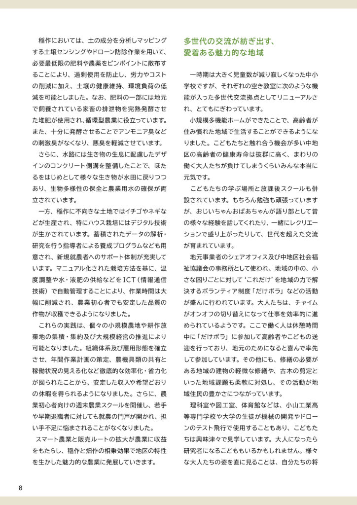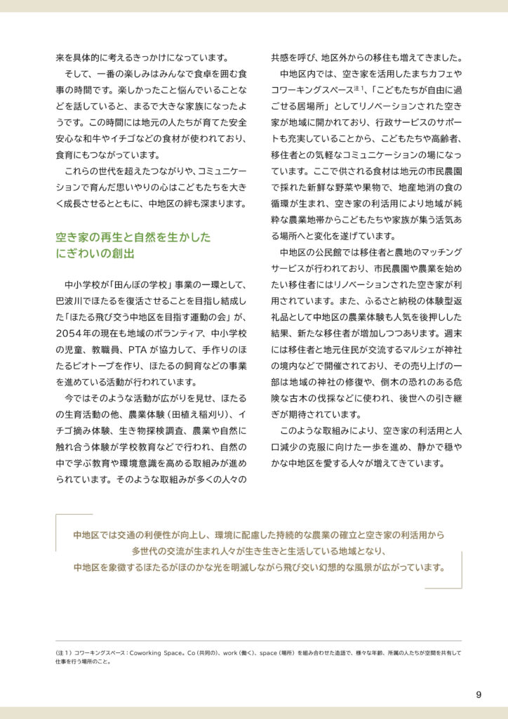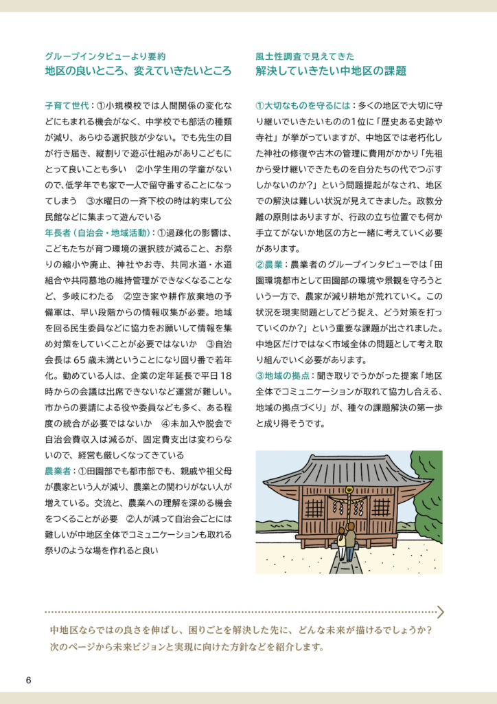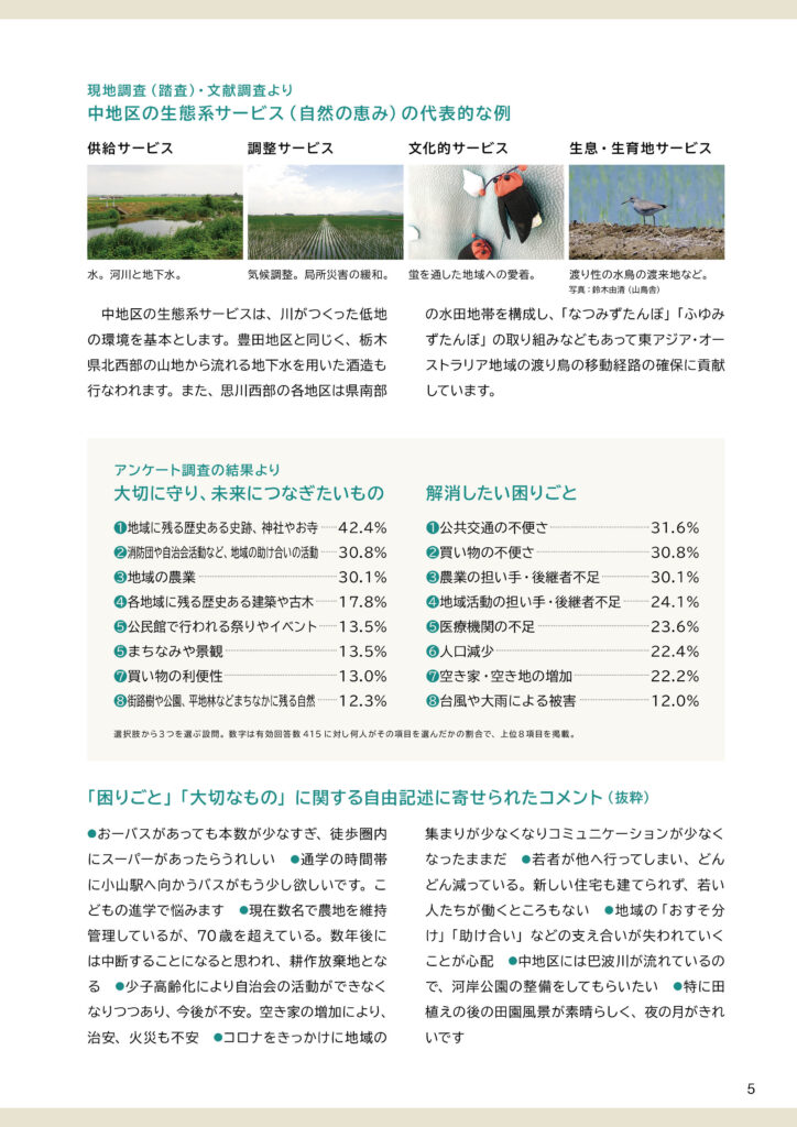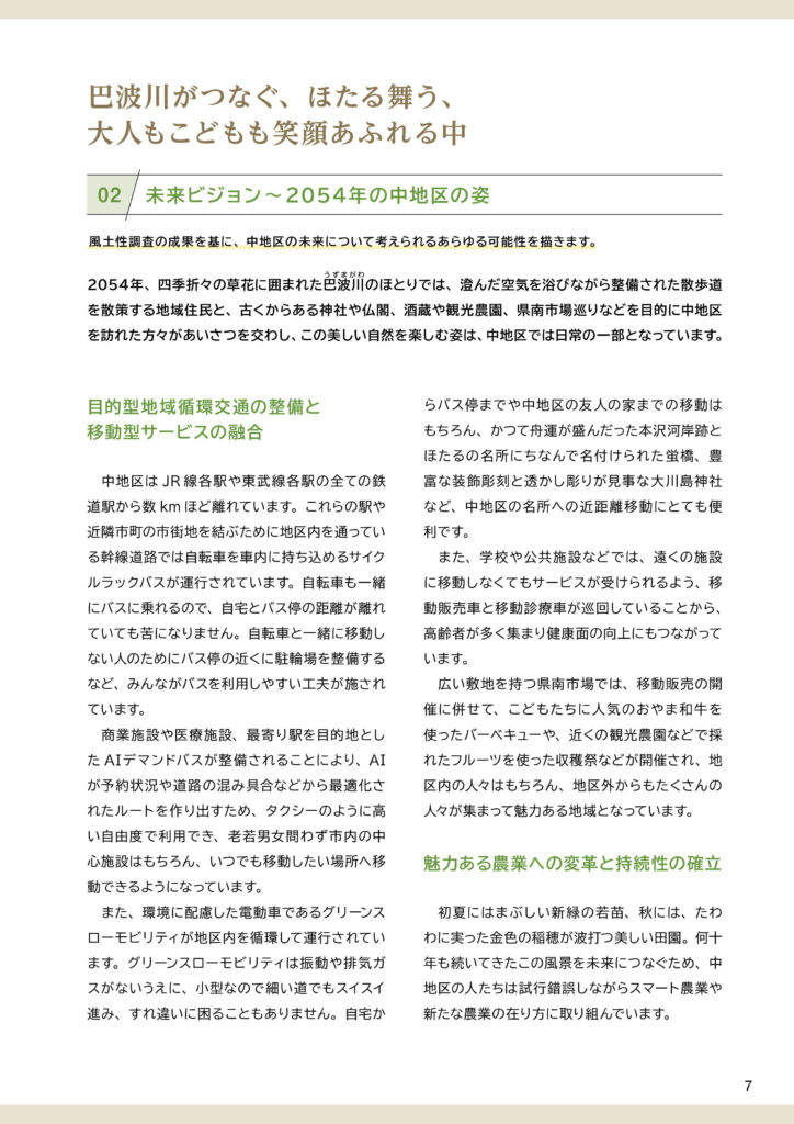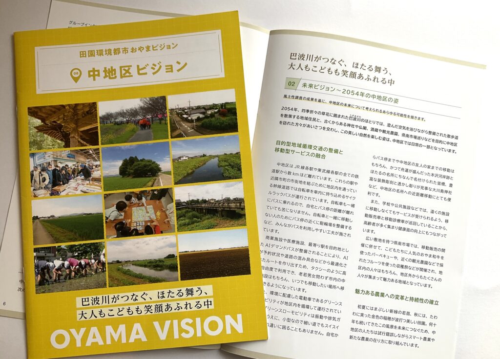 地区別のビジョン冊子を制作しました。冊子の構成は以下のとおりです。①ビジョンと策定プロセスの説明 ②地区別ビジョン(本編より転載) ③アサッテ広場に連載していた白鴎大学地域メディア実践ゼミの取材制作による「未来ノート」④地区の自然の恵み(生態系サービス)