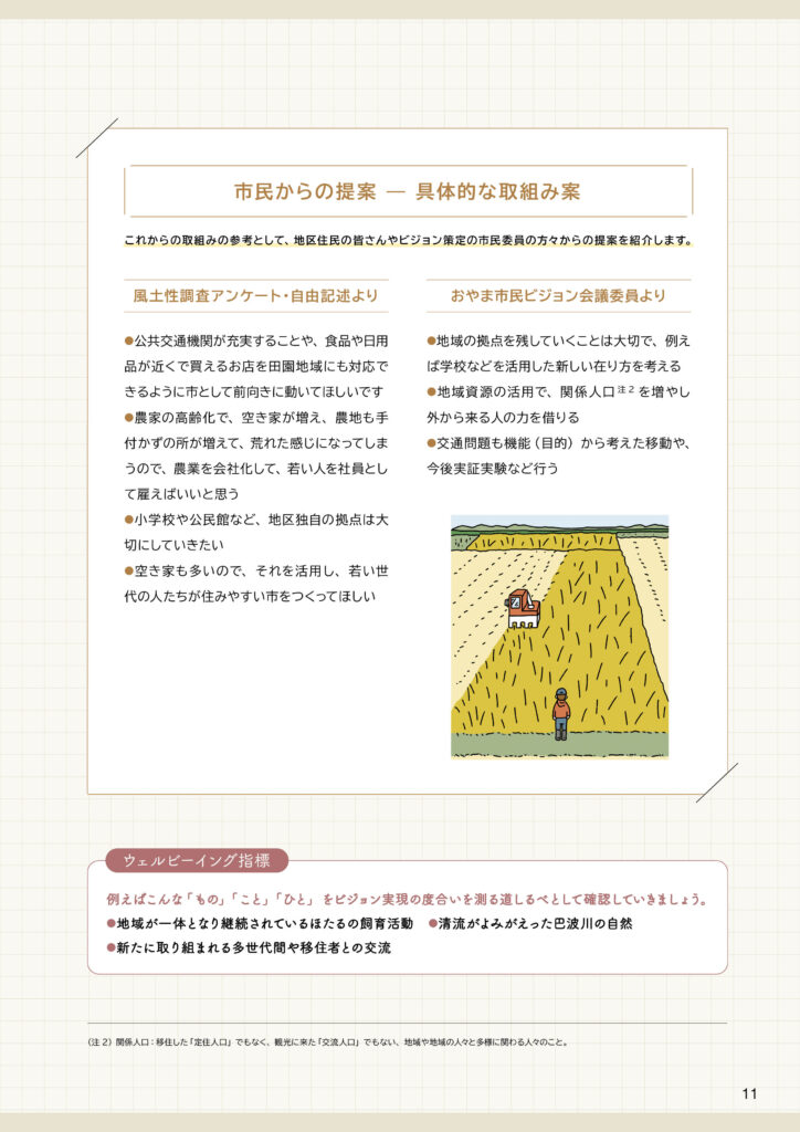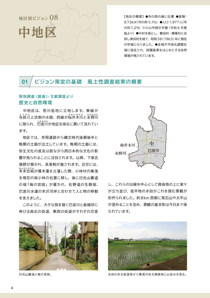 中地区ビジョンと策定前後の取組みについて中地区ビジョンは、令和7(2025)年3月に完成した「田園環境都市おやまビジョン」の重要な構成要素のひとつとして策定されました。ここでは、❶策定された「中地区ビジョン」の内容、❷策定までの取組み、❸策定後の令和7(2025)年度の取組みを掲載します。