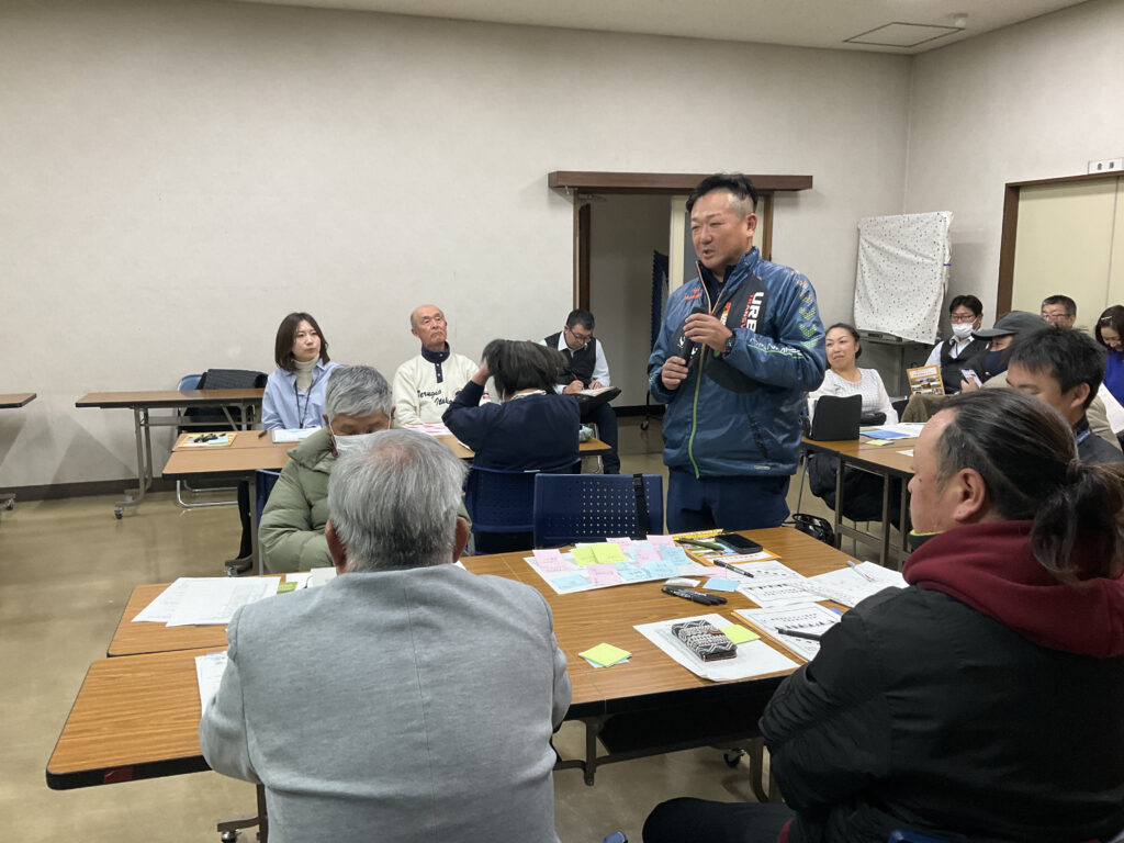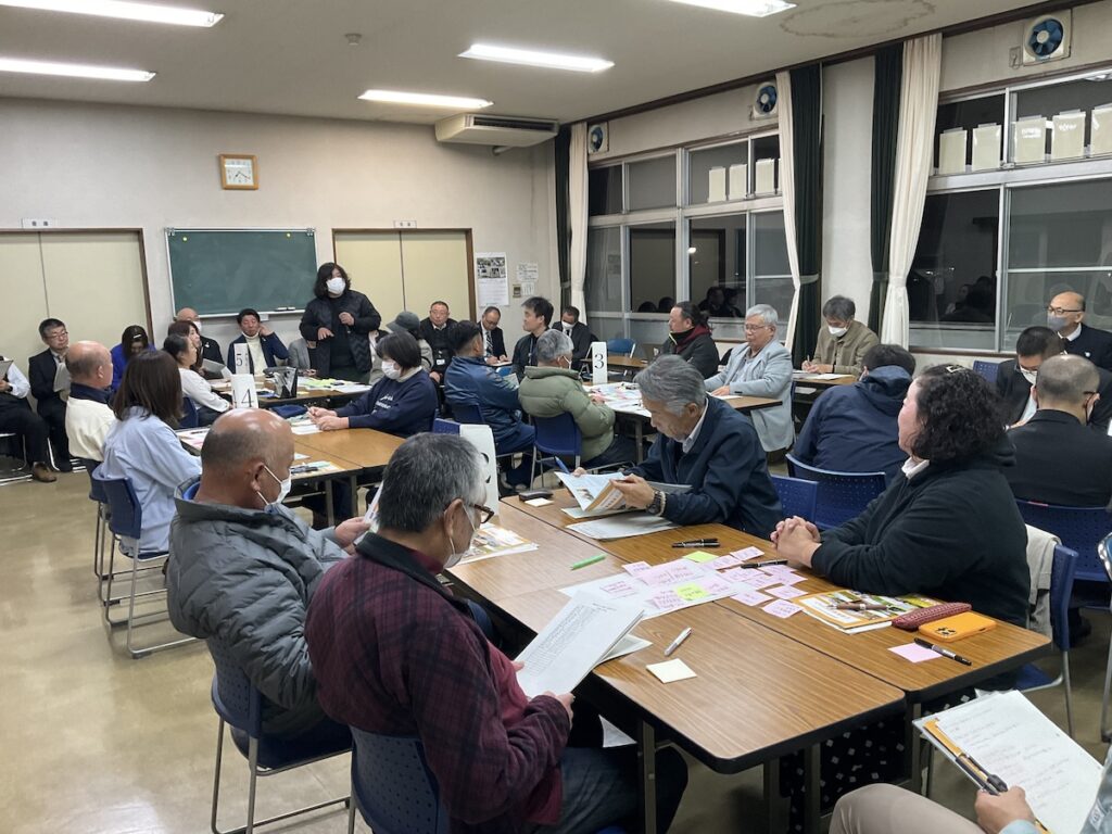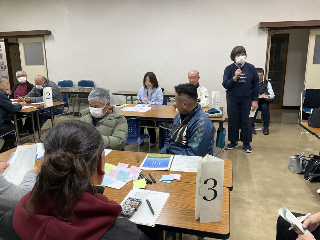 この冊子を資料として、「地区別ビジョン報告会 未来を語り合う会」と題した集まりをもちました。地区別ビジョンの策定プロセスや内容についての報告を行い、さらに参加の皆様で地区の未来について意見交換を行いました。
