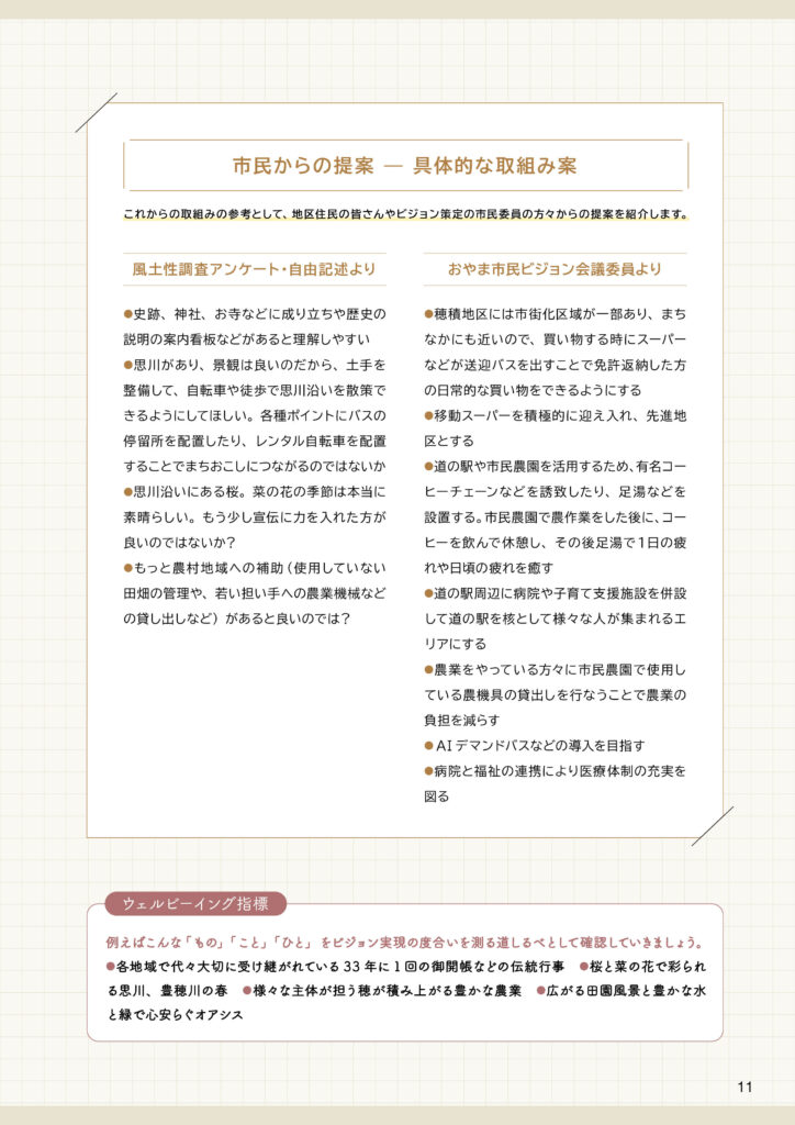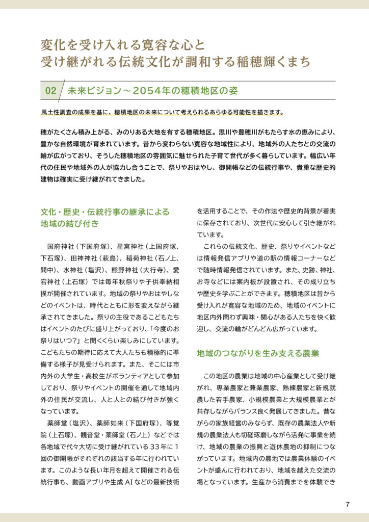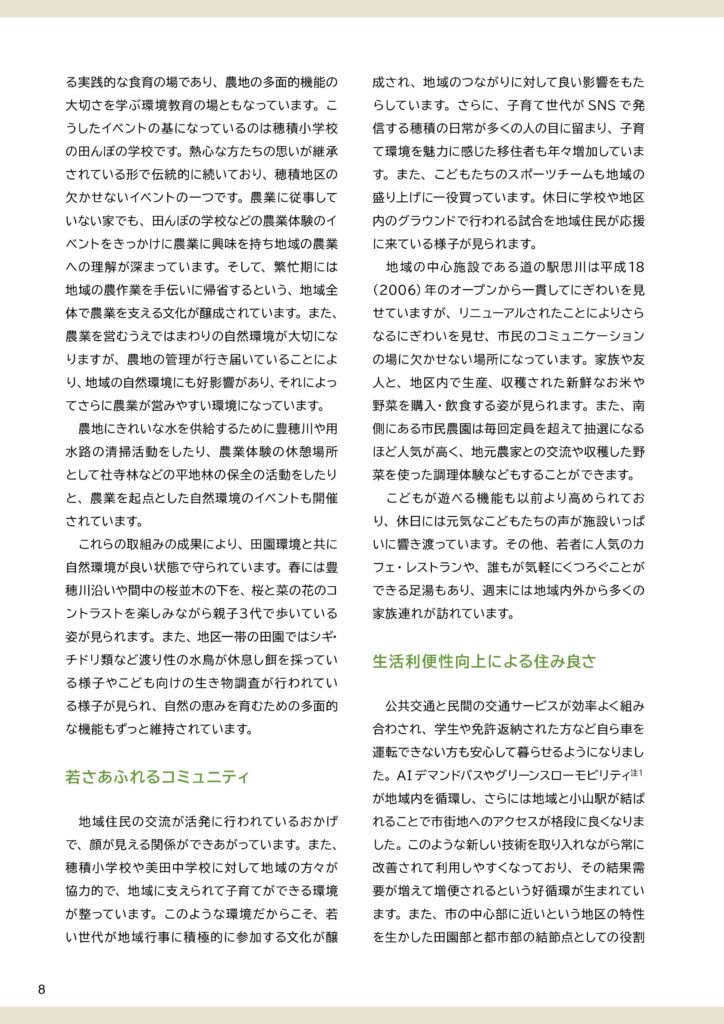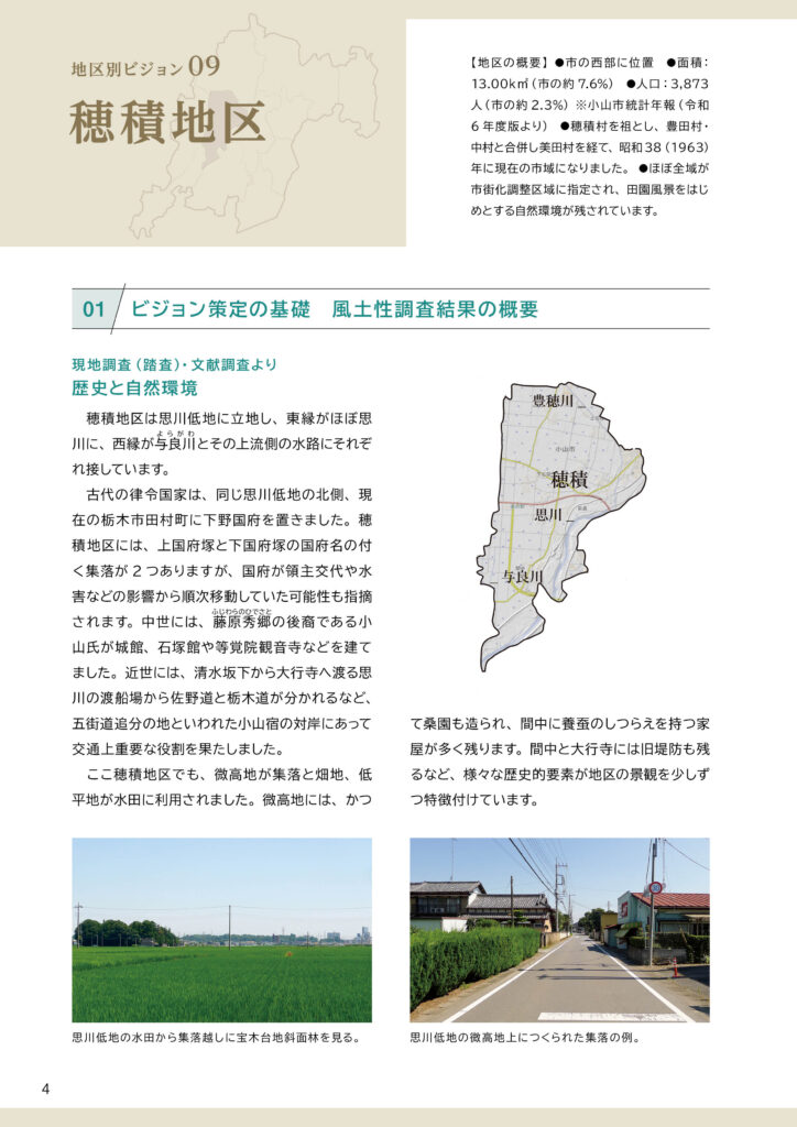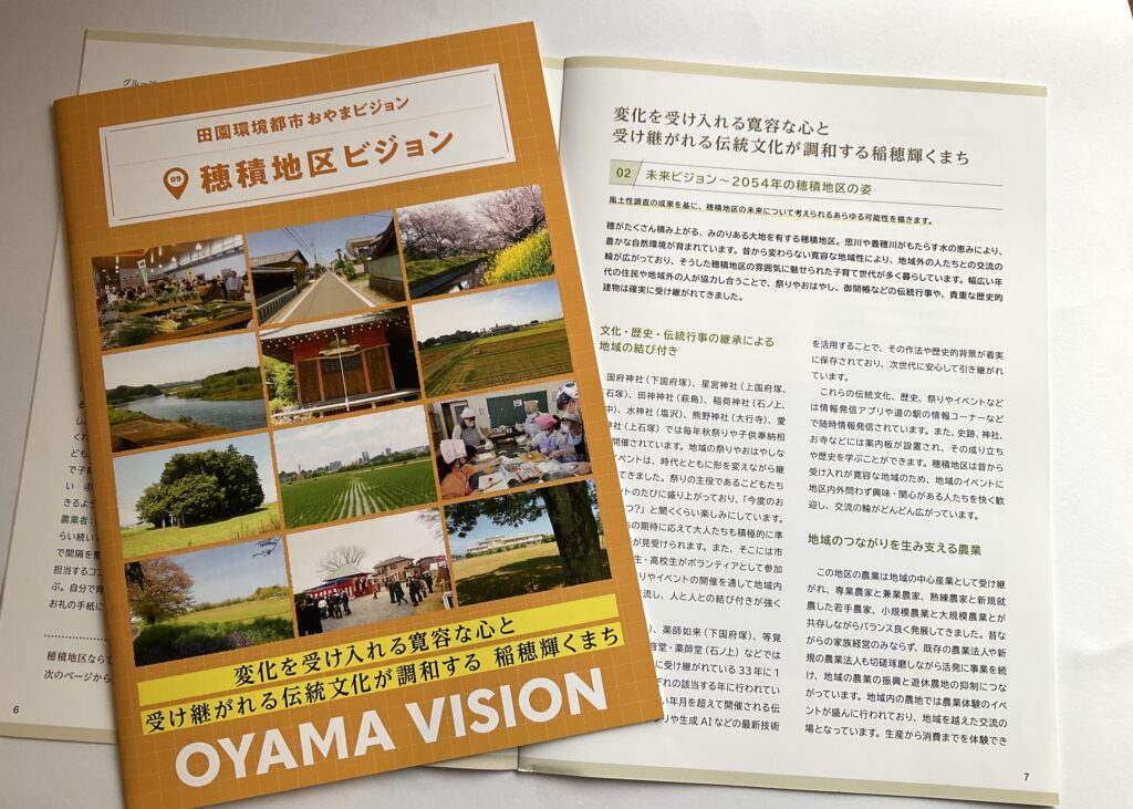 穂積地区ビジョンと策定前後の取組みについて穂積地区ビジョンは、令和7(2025)年3月に完成した「田園環境都市おやまビジョン」の重要な構成要素のひとつとして策定されました。ここでは、❶策定された「穂積地区ビジョン」の内容、❷策定までの取組み、❸策定後の令和7(2025)年度の取組みを掲載します。