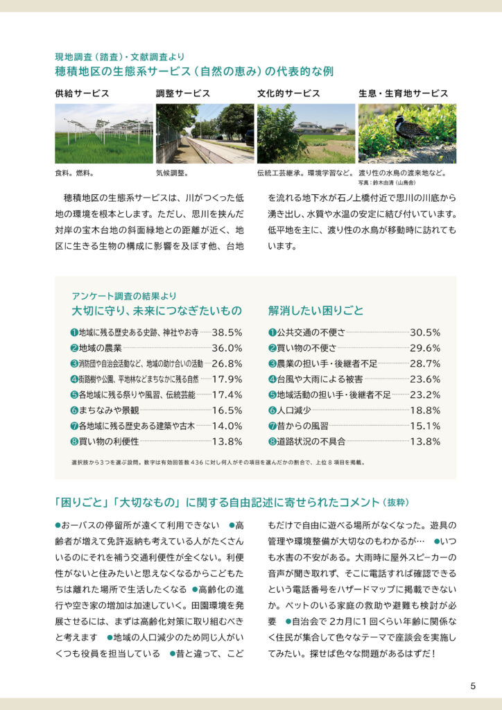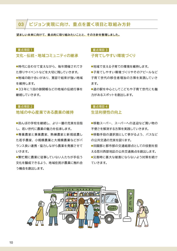 地区別のビジョン冊子を制作しました。冊子の構成は以下のとおりです。①ビジョンと策定プロセスの説明 ②地区別ビジョン(本編より転載) ③アサッテ広場に連載していた白鴎大学地域メディア実践ゼミの取材制作による「未来ノート」④地区の自然の恵み(生態系サービス)