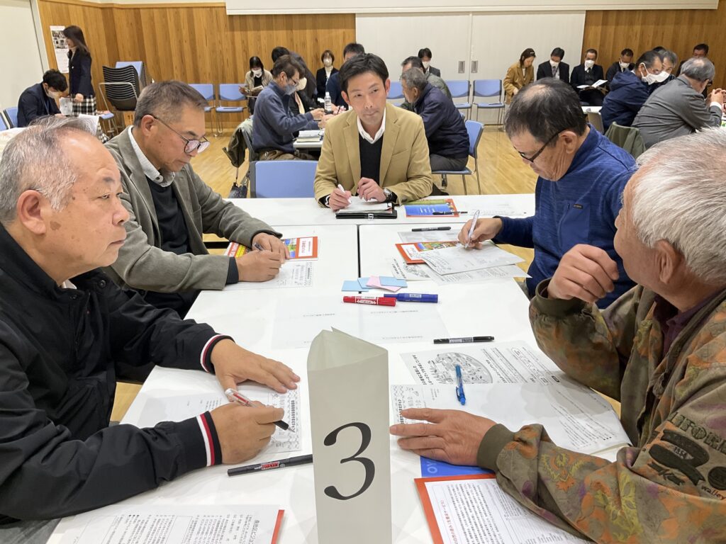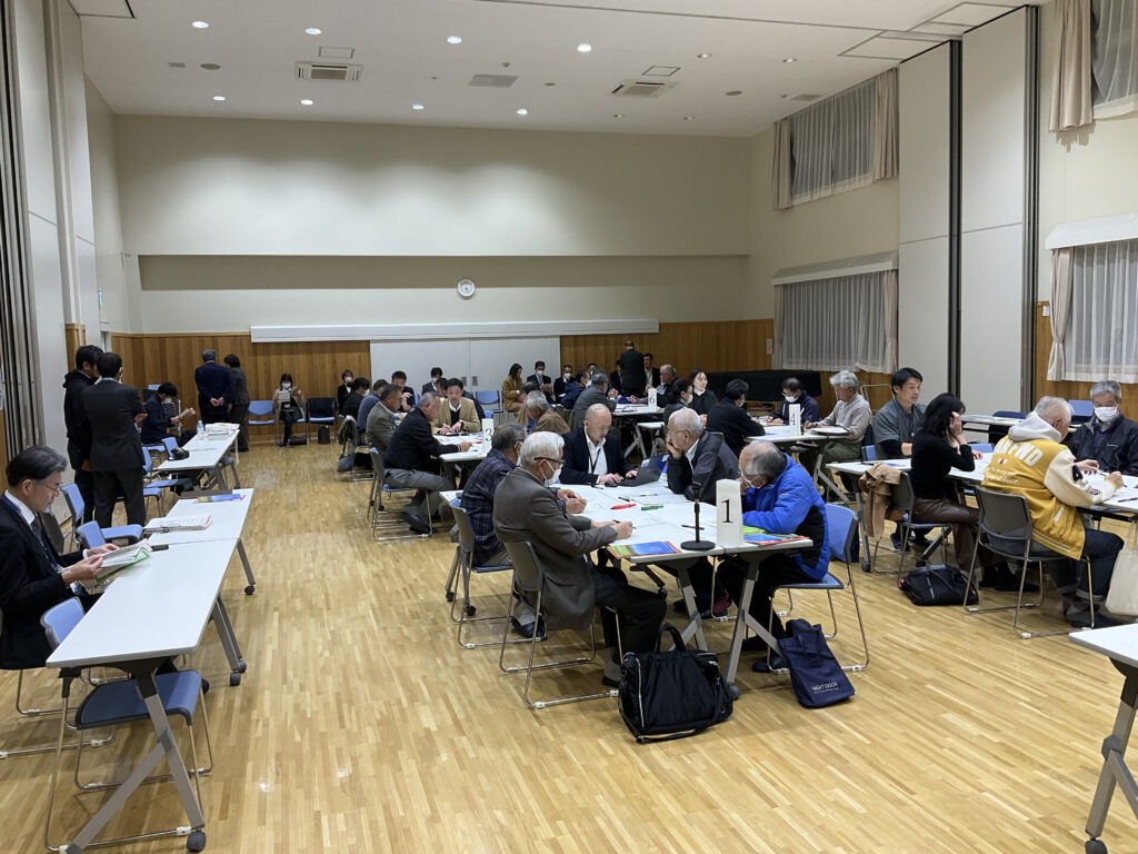 この冊子を資料として、「地区別ビジョン報告会 未来を語り合う会」と題した集まりをもちました。地区別ビジョンの策定プロセスや内容についての報告を行い、さらに参加の皆様で地区の未来について意見交換を行いました。
