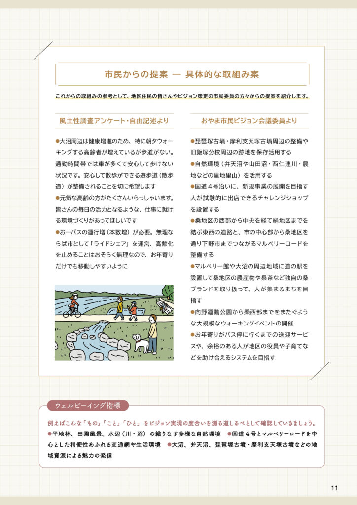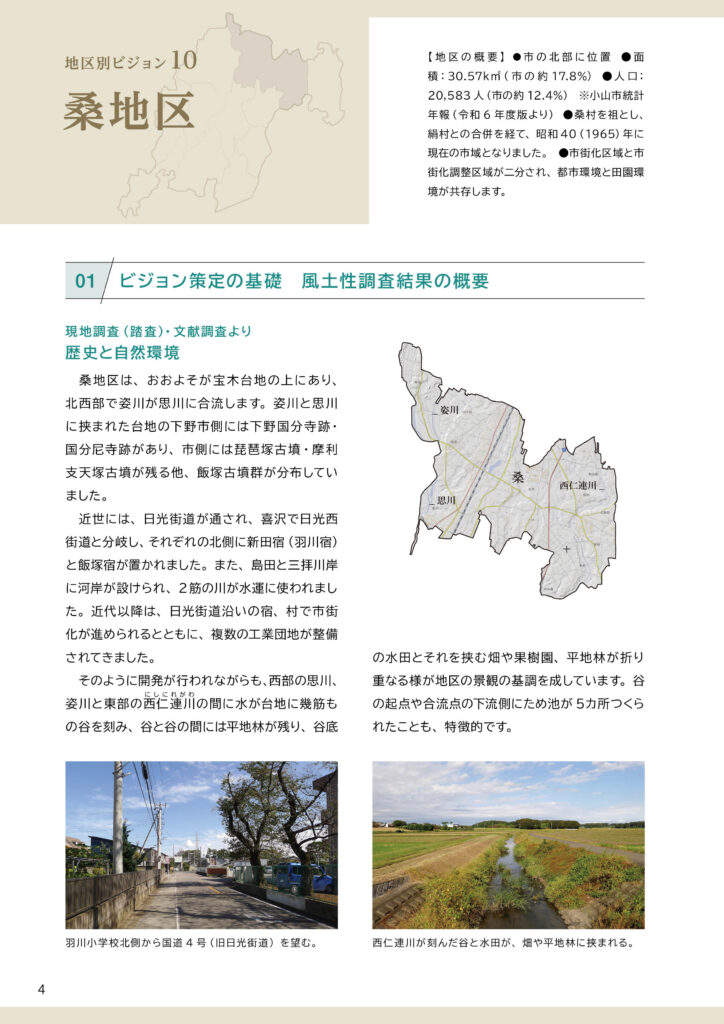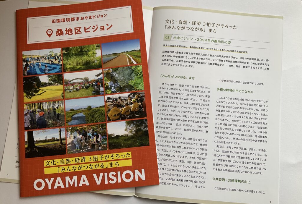 桑地区ビジョンと策定前後の取組みについて桑地区ビジョンは、令和7(2025)年3月に完成した「田園環境都市おやまビジョン」の重要な構成要素のひとつとして策定されました。ここでは、❶策定された「桑地区ビジョン」の内容、❷策定までの取組み、❸策定後の令和7(2025)年度の取組みを掲載します。