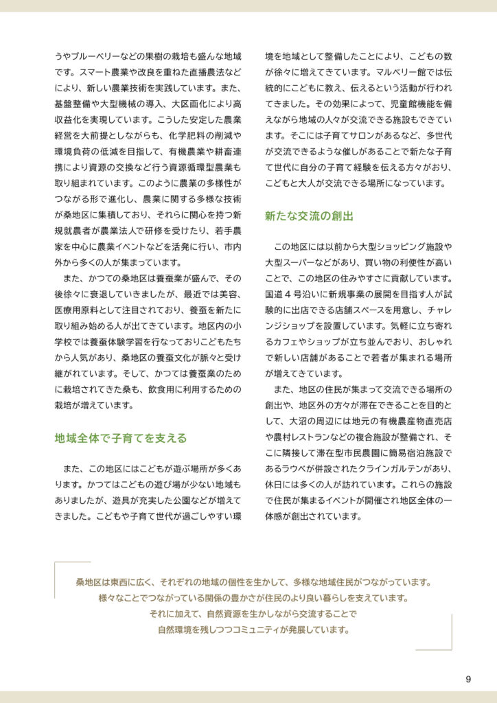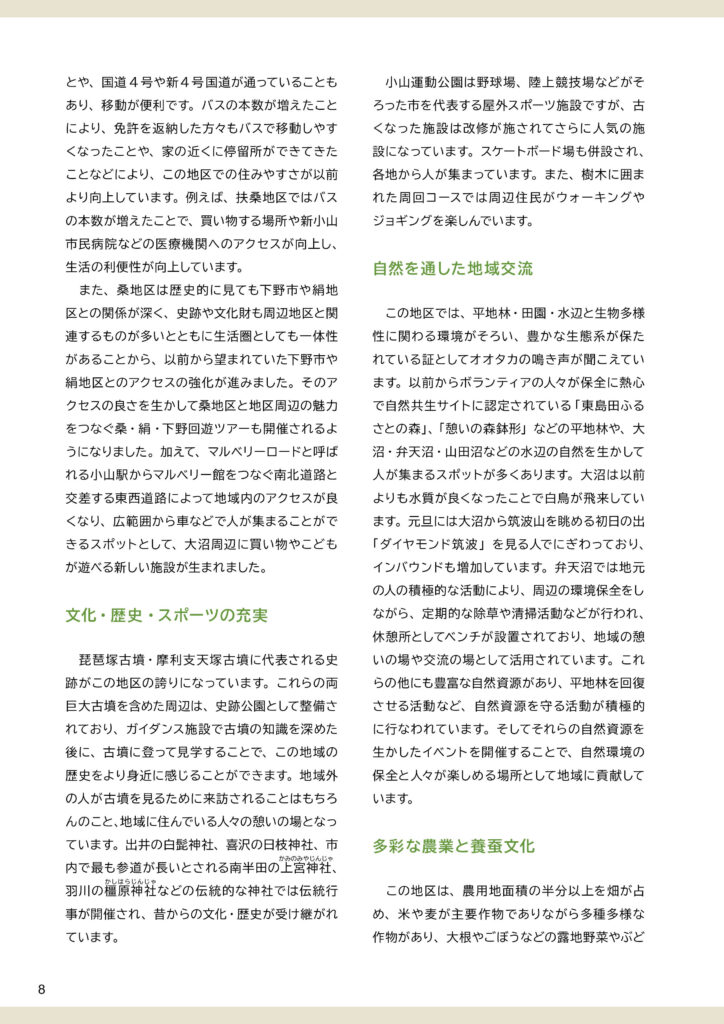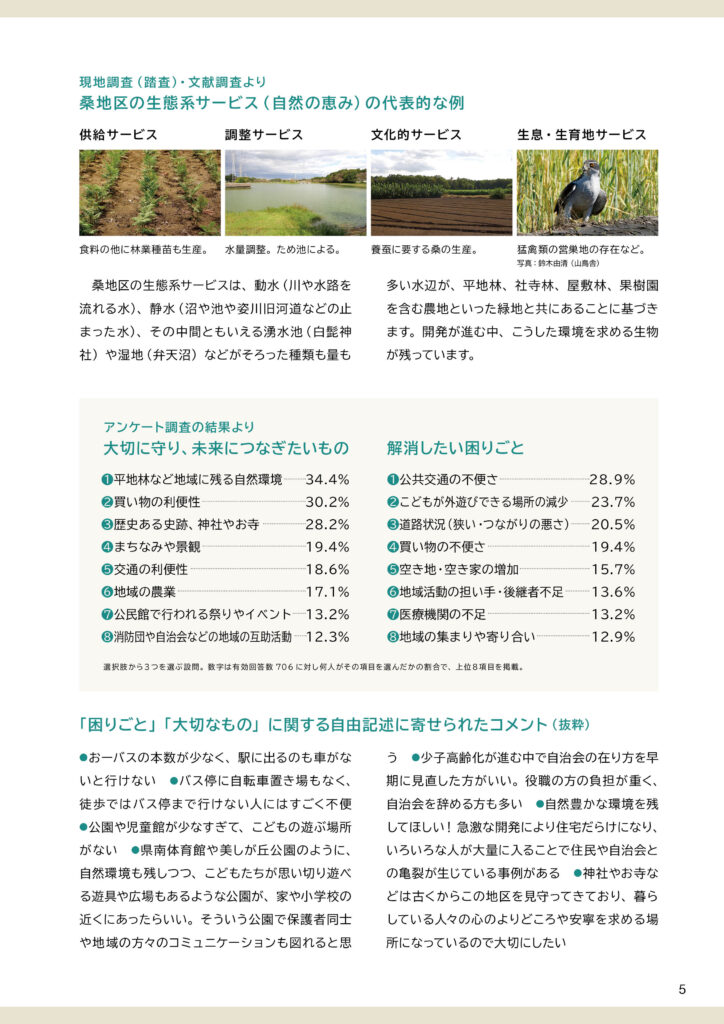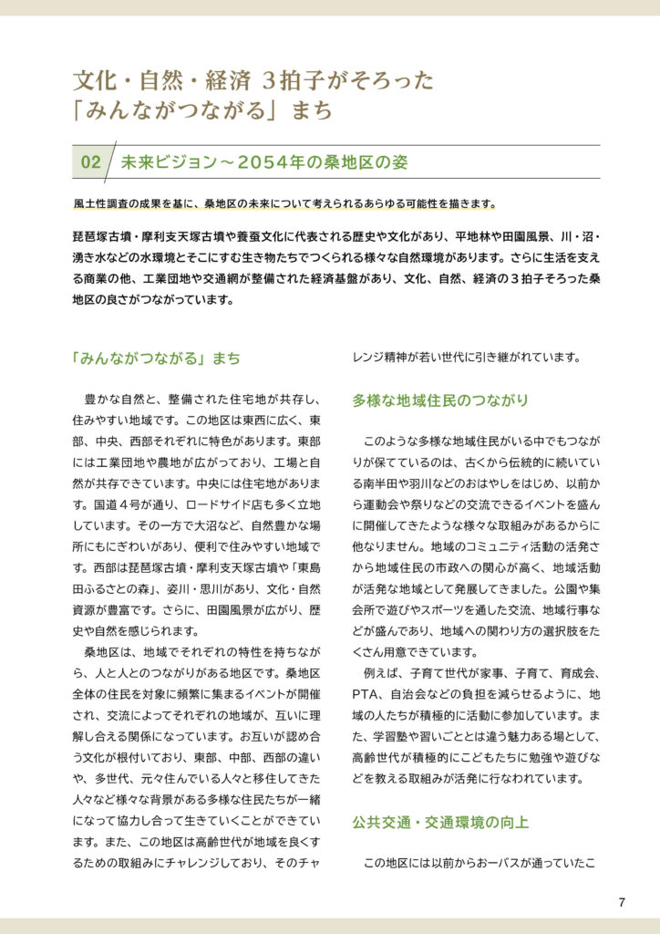 地区別のビジョン冊子を制作しました。冊子の構成は以下のとおりです。①ビジョンと策定プロセスの説明 ②地区別ビジョン(本編より転載) ③アサッテ広場に連載していた白鴎大学地域メディア実践ゼミの取材制作による「未来ノート」④地区の自然の恵み(生態系サービス)