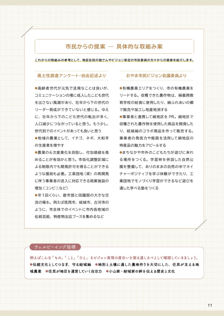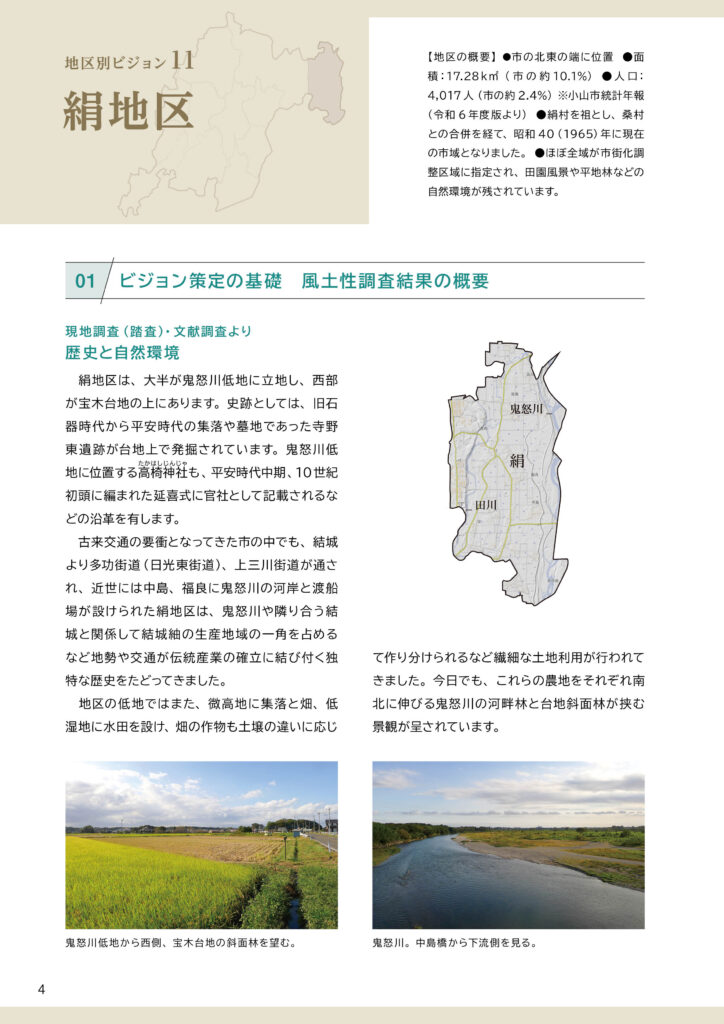 絹地区ビジョンと策定前後の取組みについて絹地区ビジョンは、令和7(2025)年3月に完成した「田園環境都市おやまビジョン」の重要な構成要素のひとつとして策定されました。ここでは、❶策定された「絹地区ビジョン」の内容、❷策定までの取組み、❸策定後の令和7(2025)年度の取組みを掲載します。