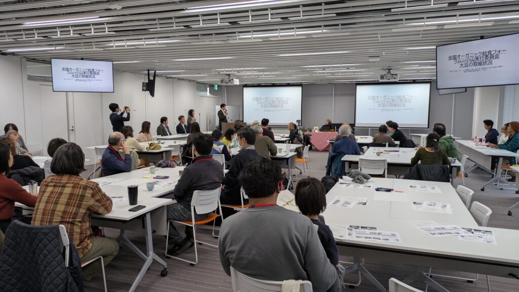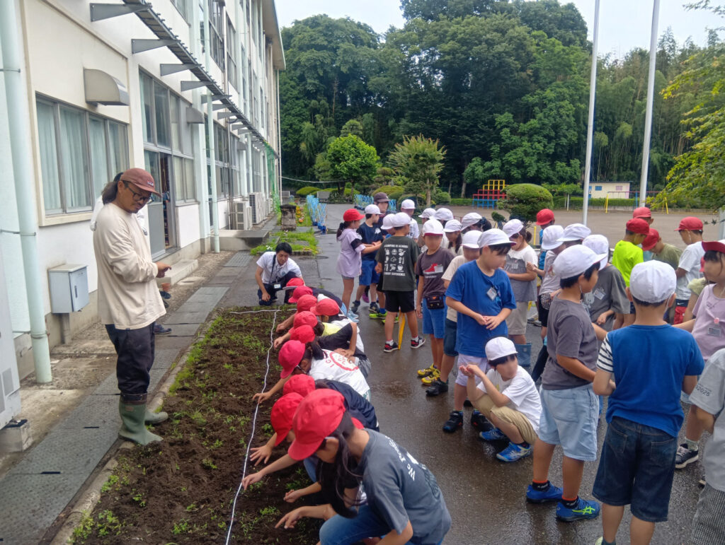前年度から引き続き、小山市有機農業推進協議会の主催、小山っ子の未来を守る会の共催で、「オーガニック講座」を開催しています。また、田園環境都市おやまビジョンで描いた、「地産地消・食育・小中学校敷地内でのエディブル・スクールヤードなどの推進」の第一歩として、新たに2つの取組みを行っています。こどもたちと食・農・環境をつなぐ菜園学習について学びと理解を深める「こどもまんなかオーガニック給食セミナー」を2回開催し、こどもたちが市内の農家さんたちの指導のもと学校菜園で大豆を育てたり、市民団体のサポートを受け味噌作りの体験会を行ったりとさまざまな取組みを行っています。