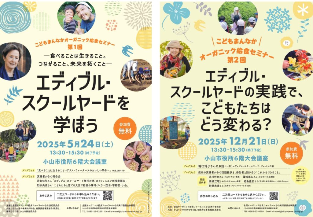 ◾️2025年5月と12月に開催した「こどもまんなかオーガニック給食セミナー」のチラシ(それぞれ表面)